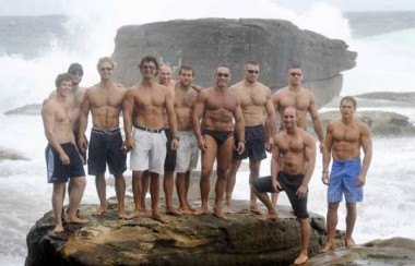 Over in the outdoor gym by the North Bondi surfclub a couple of men are exercising – big men, all hugely muscled and roped all around their limbs with heavy veins.
