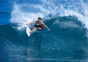 This glassy little frother hardly deserves the drama. Mr Reynolds must view his backhand capabilities with a lot of misgivings if he needs the assistance of his hand to (1) assist in bringing the board around and (2) help  him with his point of balance – the technique will result in a tripod stance effectively. How ungainly, perhaps he needs a paddle.