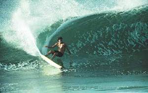 The shot itself is remarkable in that the rider looks almost stationary, as does the wave – the only signs of power and speed are in the track, Curren has done everything by bodyweight transfer alone,  there is no sign of any exertion or effort in his physical demeanour – every finger is relaxed – I would like to draw a line through his centre of gravity and see what its relationship is to the angle of his board and the wave face. There has got to be a measurement of this perfection for the wave pool architects to work on – Imagine all those Japanese  / Texan surfing gentlemen pouring on this type of turn (together) in one of those majestic surfing facilities.