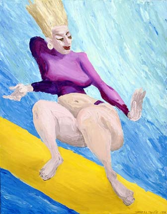 Pamela has painted a reasonably heavy mature woman wearing a long-sleeved purple skivvy and string bikini bottom riding a yellow board on a blue wave. The woman is sans brassiere, unattractively so it must be said. We are reminded of that Nat Young * classic ‘ Fall Line ‘ as there is an intriguing symmetry here between the angle of the subject’s descent and the effect of gravity on her unsupported breasts.
