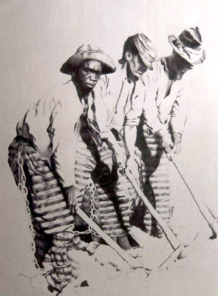Lambton was the first to notice the gangs working their blunt scythes on the Alabama roadsides, chained up and striped old boys tiredly hacking back the thousands of narrow miles of sunstruck highway weeds, all their heads down and and in slow motion fifteen-hour labour and living jail sentences long enough to define eternity.