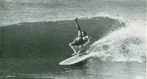 This is an early lay-back, high-kick, arms-free, aerial backdraft power-boost. Not everyone was throwing this chicken in 1961, and the judges at the NSW Titles at Bondi in ’65 must have missed Stu’s heat that day – he did one of these on waves 2, 3 and five in the heat he lost and everyone I know thought that he had a chance at Brennan that day, and Nat. Big chance!
