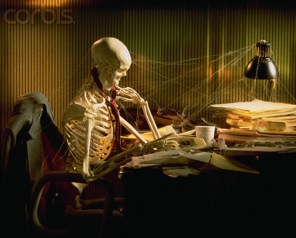 1995 — Skeleton at desk with cobwebs — Image by © Gabe Palmer/CORBIS