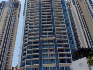 When a man is twenty-six stories up on one of those narrow Goldie balconies, looking down at the poolside arrangements – the waterfalls and shallows, the groves of palms and tended pathways.