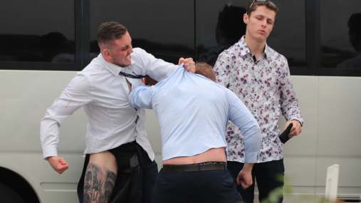 Halfway through the encounter now and we can see the punter has re-engaged with the wild swinger in what looks like an ungainly attempt to land his right hand somewhere hurtful while at the same time demonstrating he has developed a sturdy right thigh which he appears to have had tattooed in a Bali ink-parlour. We’re not sure which of the participants was responsible for tearing his trousers, possibly the man he’s trying to kill.