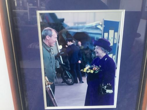 HM with my wife’s younger brother, Flight Lieutenant Terry Cairns RAF … she’d just presented him with the Sword of Honour, and not for the first time. He told me he thought she liked him, as he did her.
