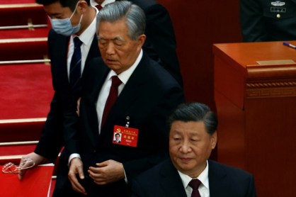 Saturday 22 Oct 2022. Former Chinese President Hu Jintao is gently shouldered off the stage during the closing ceremony of the 20th National Congress of the Communist Party of China in Beijing.