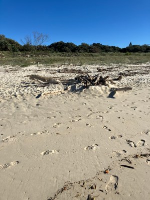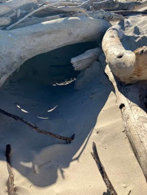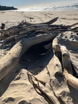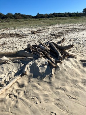 Just a bundle of driftwood piled up on the dry sand out of the tide’s way, probably washed up months ago by the last big sea.